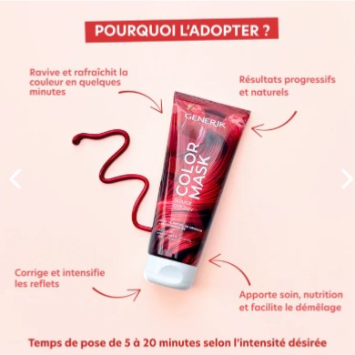 Color Mask Rouge Cherry de Generik, repigmente les cheveux, ravive la couleur, intensifie les reflets et redonne de l’éclat. Il offre une coloration temporaire qui s’estompe progressivement.